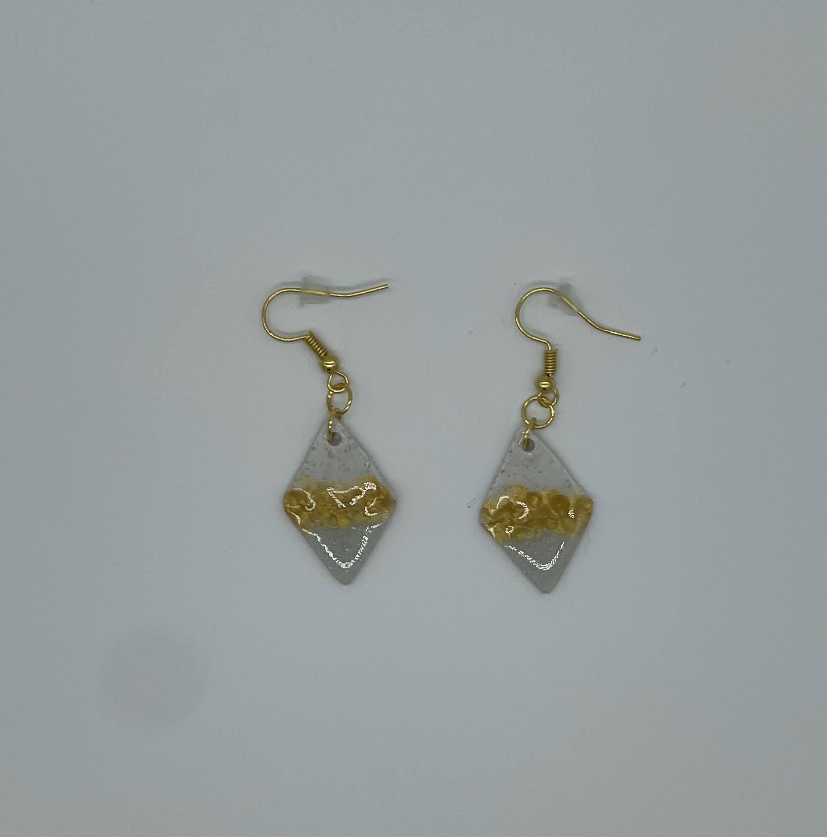 These handmade polymer clay earrings showcase a sophisticated design with a white granite hue. Shaped like diamonds, each earring features a unique detail: a scattering of yellow confetti in the middle of the rhombus. This playful yet elegant touch adds a pop of color and whimsy to the overall design, making these earrings a standout accessory for any occasion.