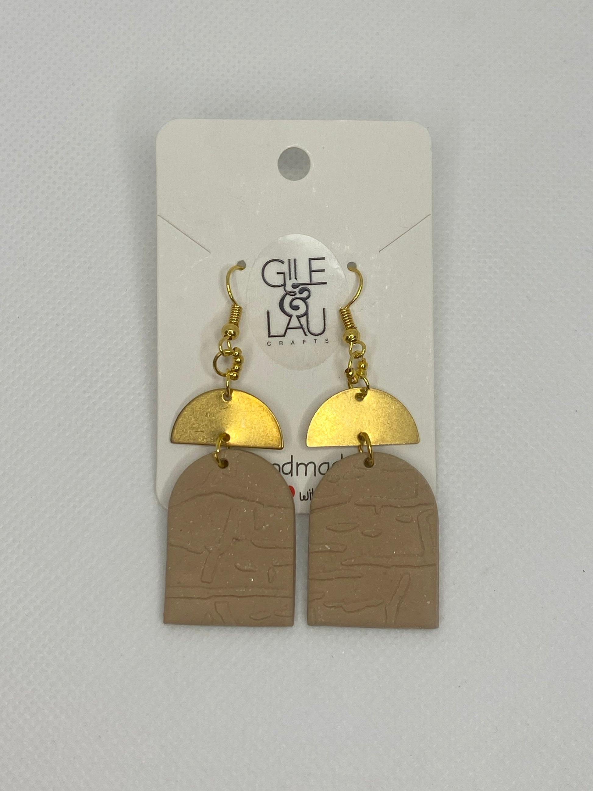 Indulge in the allure of the mystique with these handmade beige polymer clay earrings. Inspired by the arches reminiscent of a cave's entrance, each earring boasts asymmetrical relief lines for a unique touch. Suspended within a golden crescent, a mesmerizing pattern adds an elegant charm, making these earrings a captivating addition to any ensemble. It presents a beautiful variant that elegantly combines different green tones forming delicate patterns.