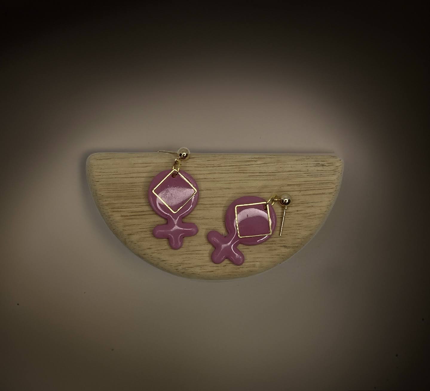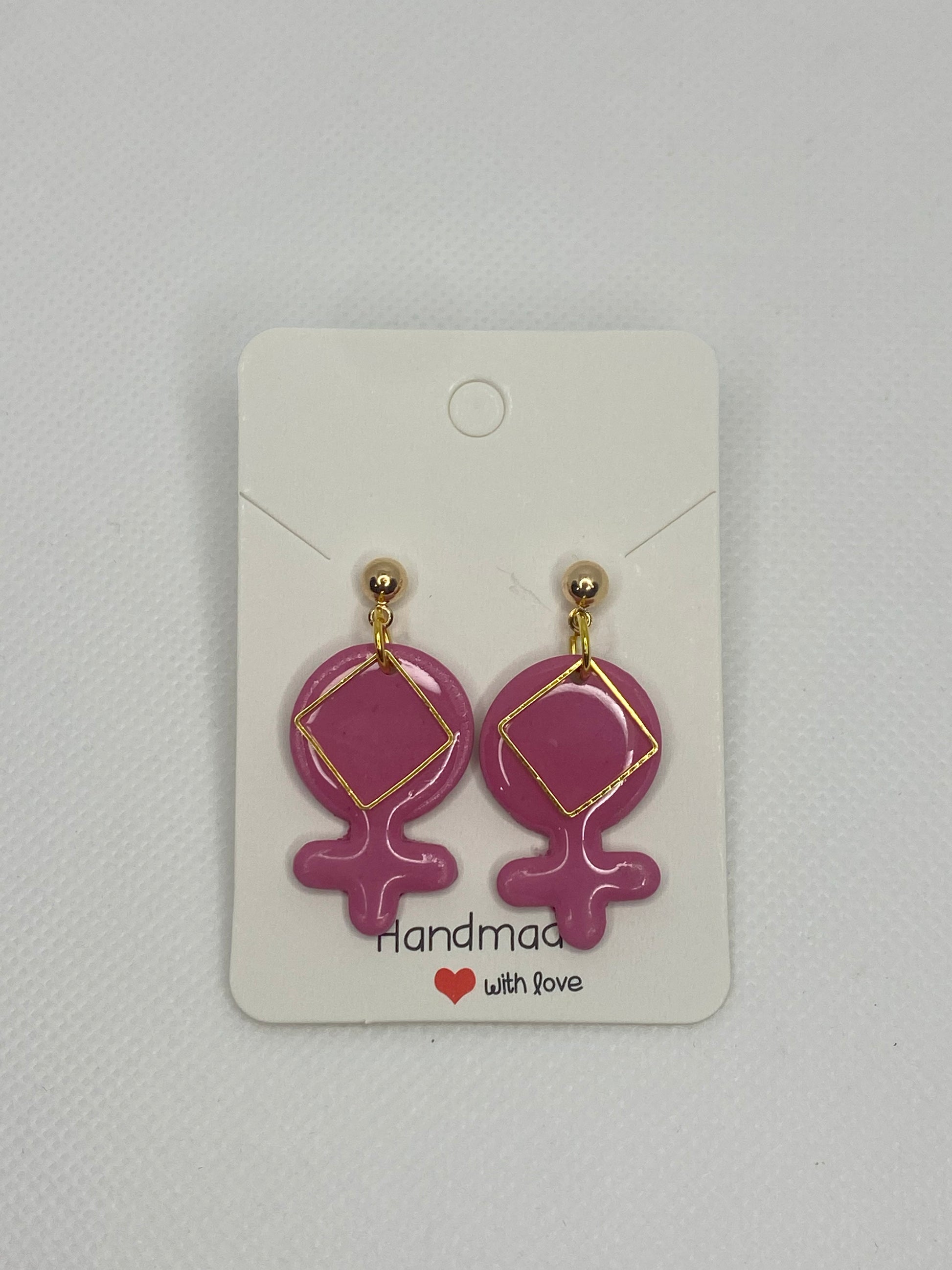 These handmade polymer clay earrings are a celebration of femininity and individuality. Crafted with a vibrant pink hue, they feature the iconic shape of the female symbol. Within the circular part of the symbol, there are two charming variations: one adorned with a radiant gold circle, with a lively confetti pattern at its center, and another showcasing a golden rhombus for added flair. Each pair is a whimsical expression of empowerment and style, perfect for making a bold statement with any outfit. |