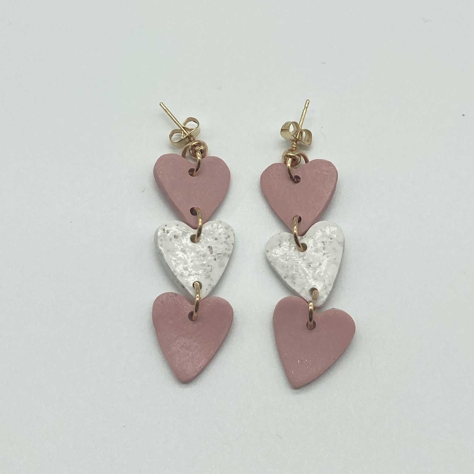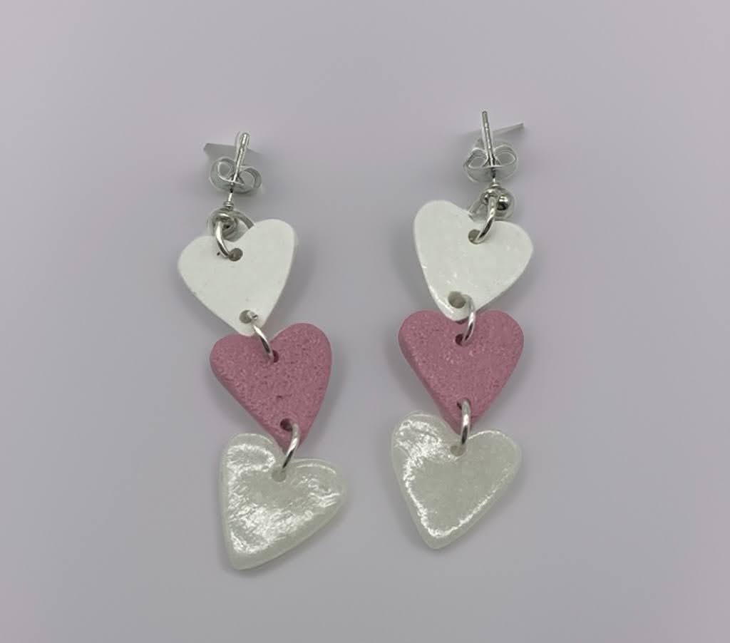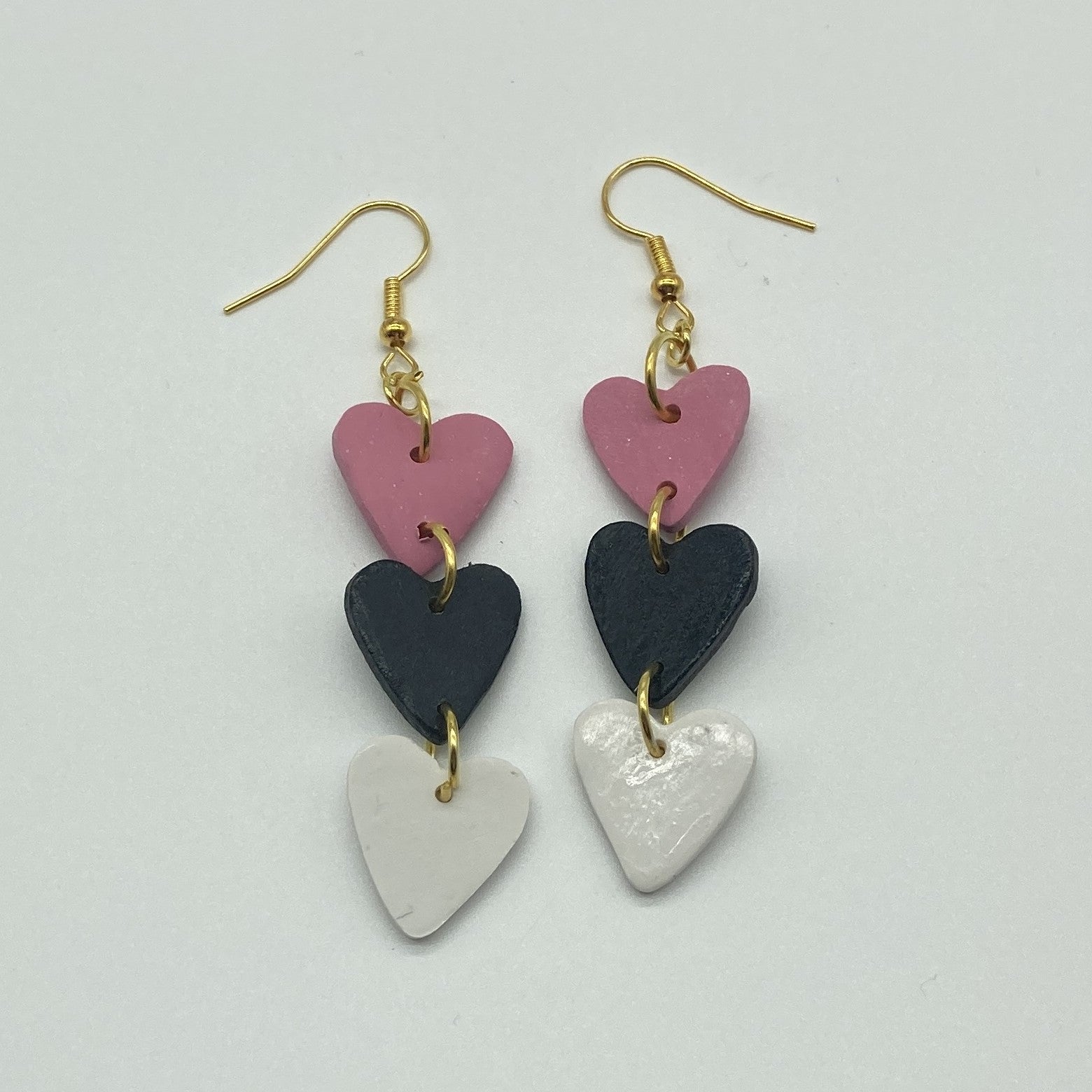 These handmade polymer clay earrings are a delightful expression of love and sweetness. Featuring a combination of pink and white hues, they are shaped into three hearts. The hearts are intricately linked together by small and delicate golden rings, creating a charming chain-like effect. These earrings are the perfect accessory to add a touch of romance and whimsy to any outfit.