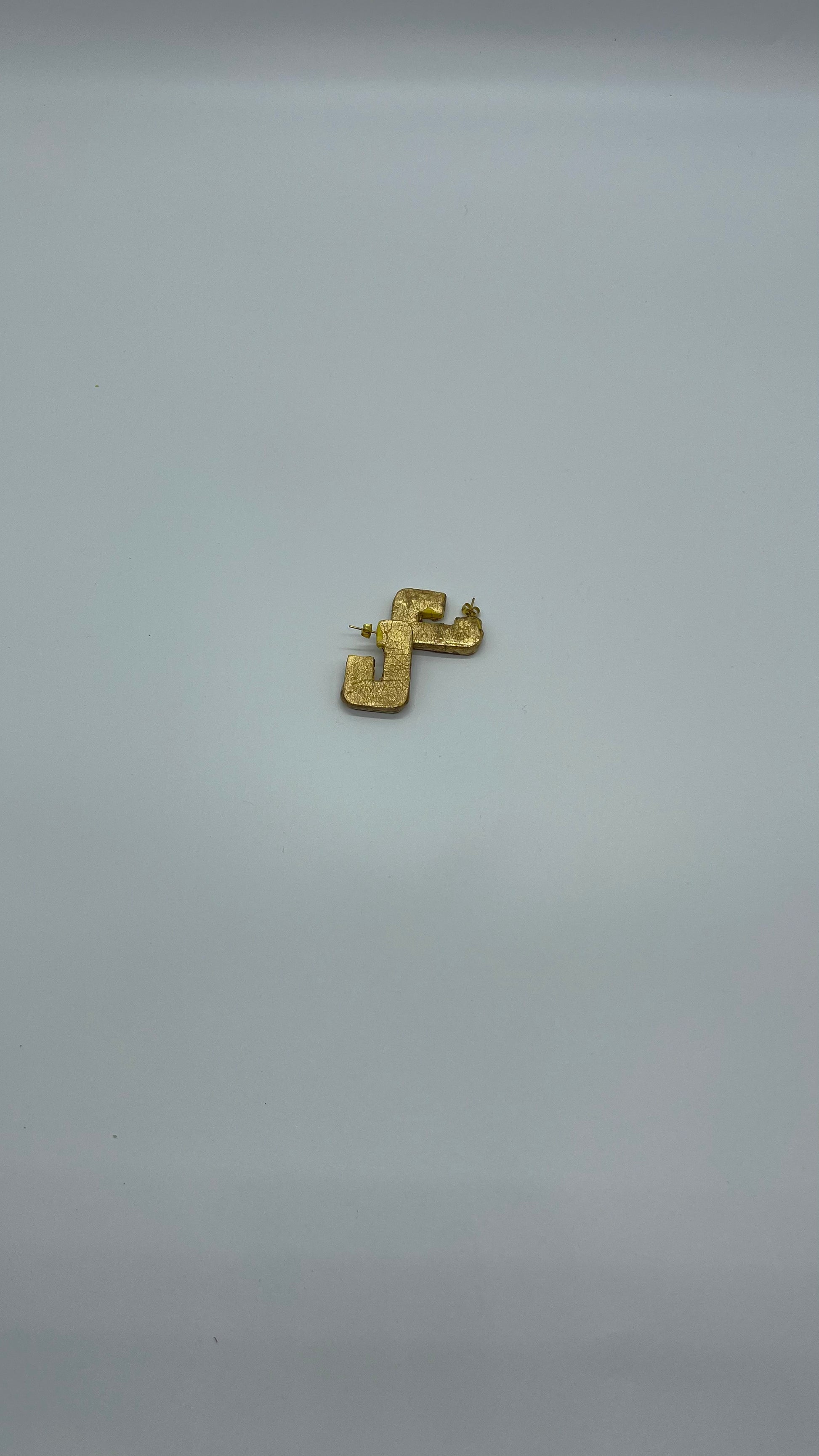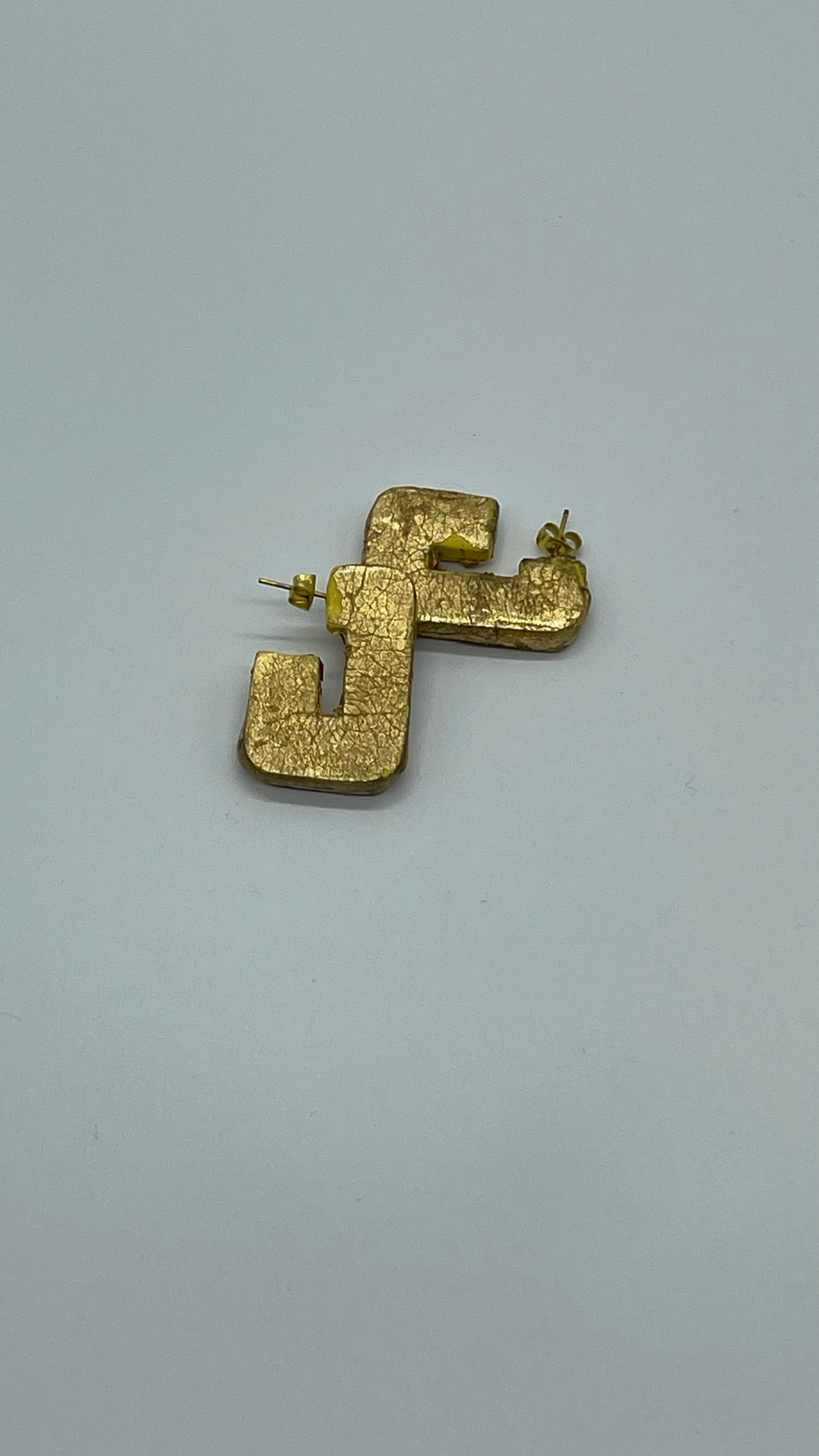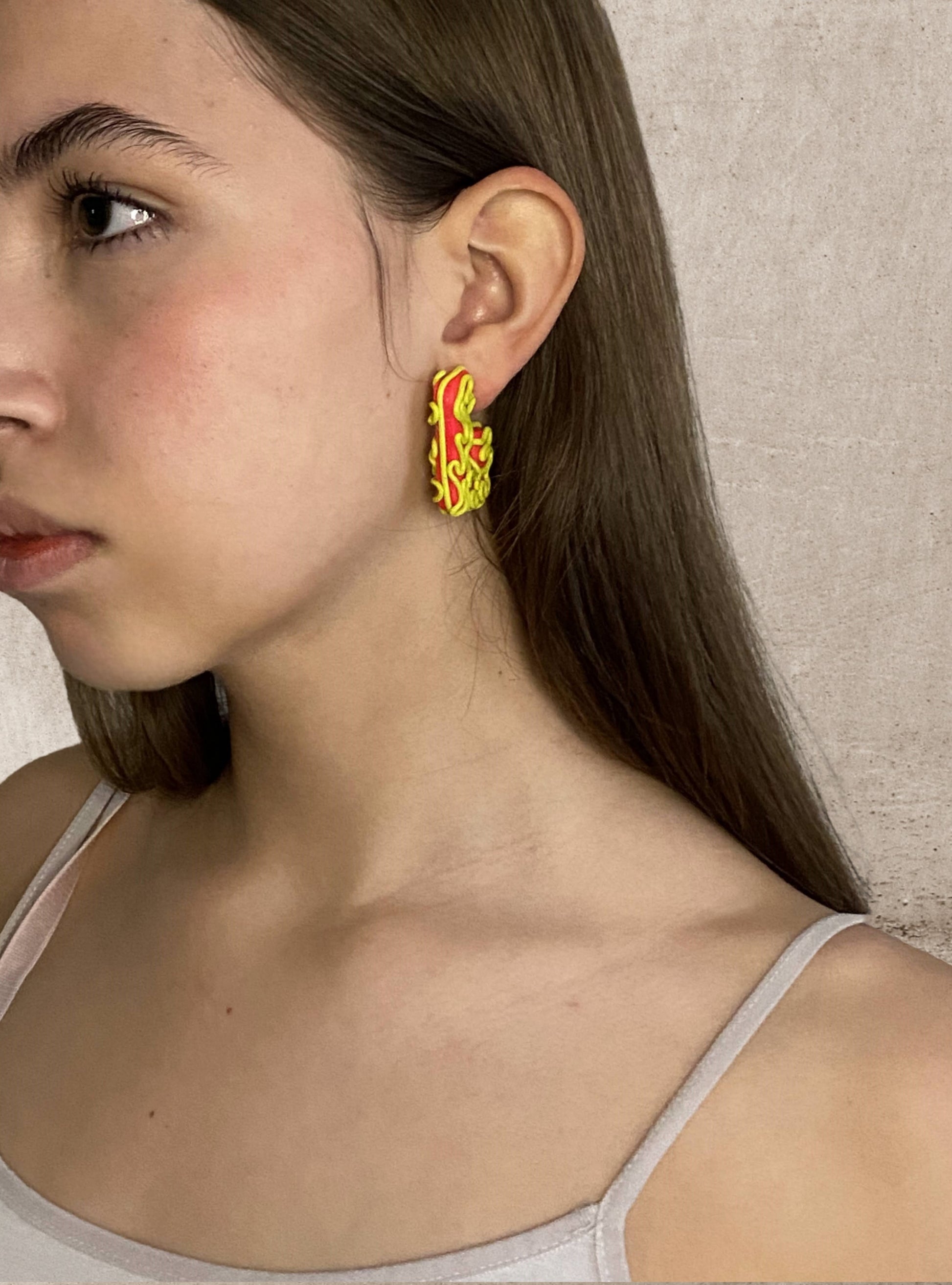 Envision a pair of lively handmade polymer clay earrings, boasting a captivating color combination of pink and neon green. Shaped like the letter "J," these earrings feature a base in vibrant neon pink, adorned with intricate embossed threads in neon green, adding depth and texture to the design.