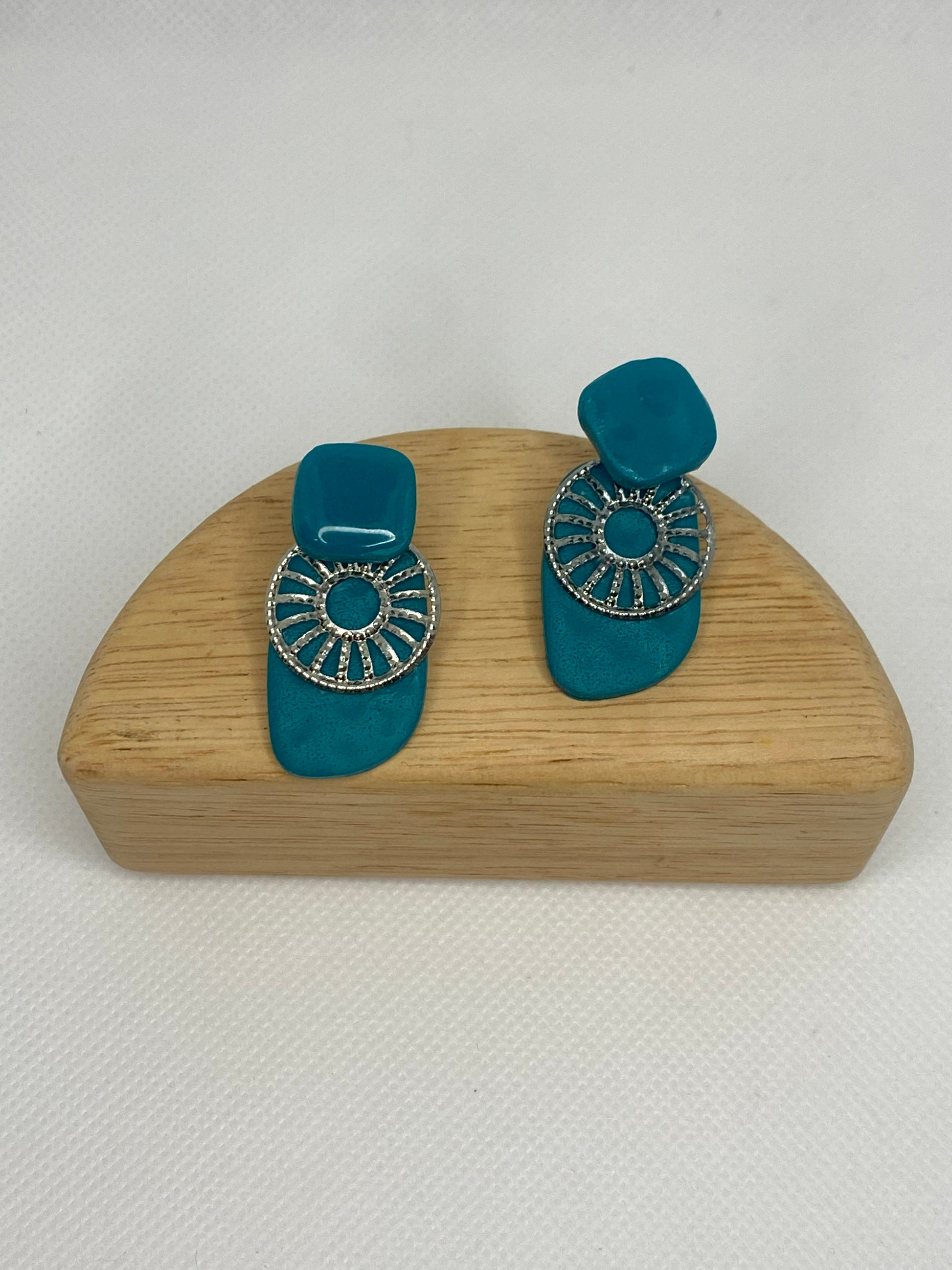 These handmade polymer clay earrings feature a captivating blue hue reminiscent of tranquil waters. The unique design includes a rock-shaped centerpiece with a rim resembling car wheels, adding a touch of urban flair. Atop the rock sits a smaller square, adding an intriguing geometric element to the overall look. These earrings are a stylish fusion of nature-inspired shapes and contemporary design.