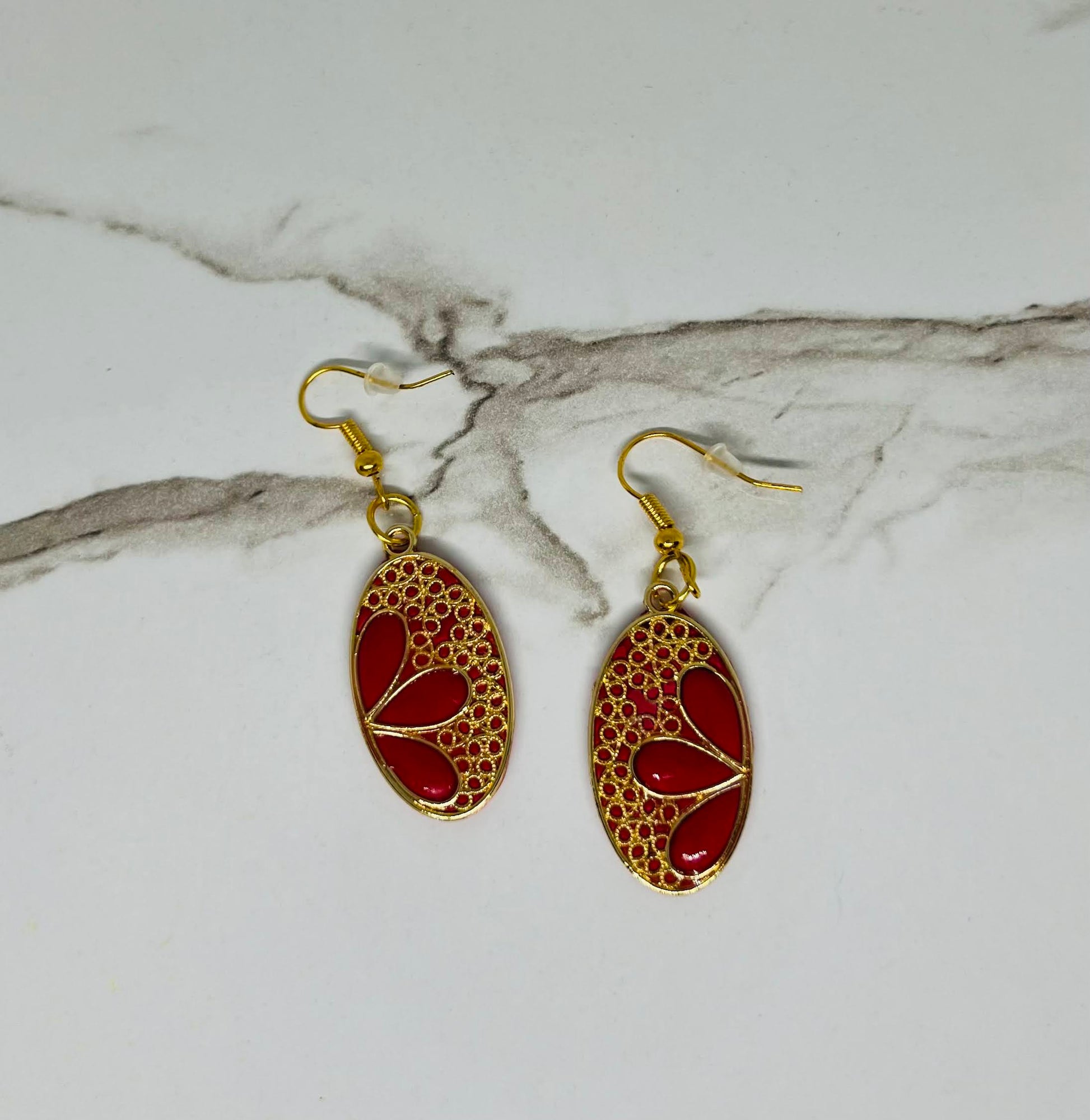 Estos aretes de arcilla polimérica hechos a mano tienen forma de ovalo y una cautivadora combinación de colores rojo y dorado. Su elegante diseño irradia sofisticación, lo que los convierte en un accesorio versátil para realzar cualquier conjunto con un toque de lujo y estilo.