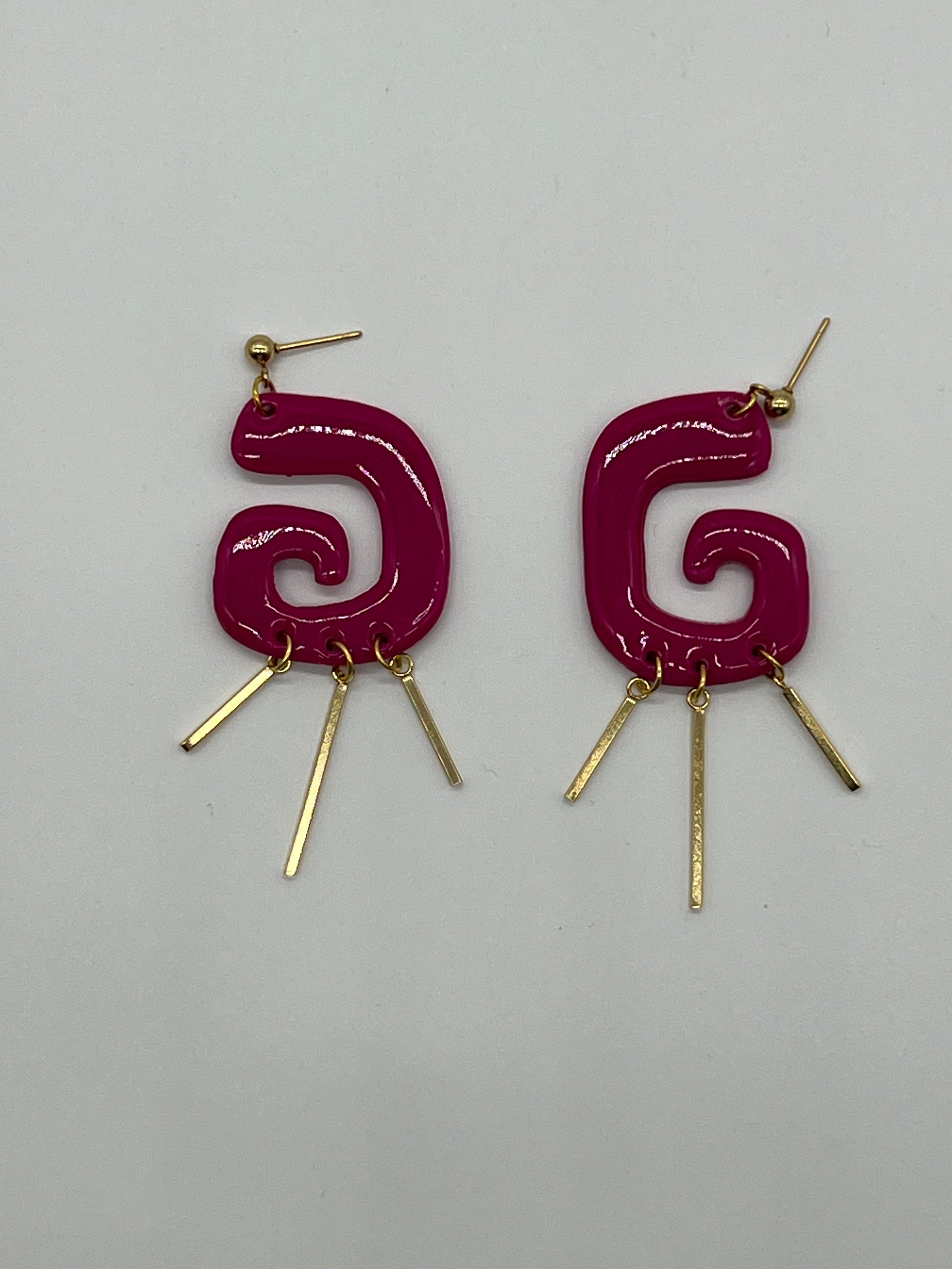 Shaped like the letter "G," they exude contemporary flair and individuality. Hanging from the "G" shape are small golden tears, adding a touch of elegance and contrast to the design. These earrings are sure to make a stylish statement and add a pop of color to any outfit.