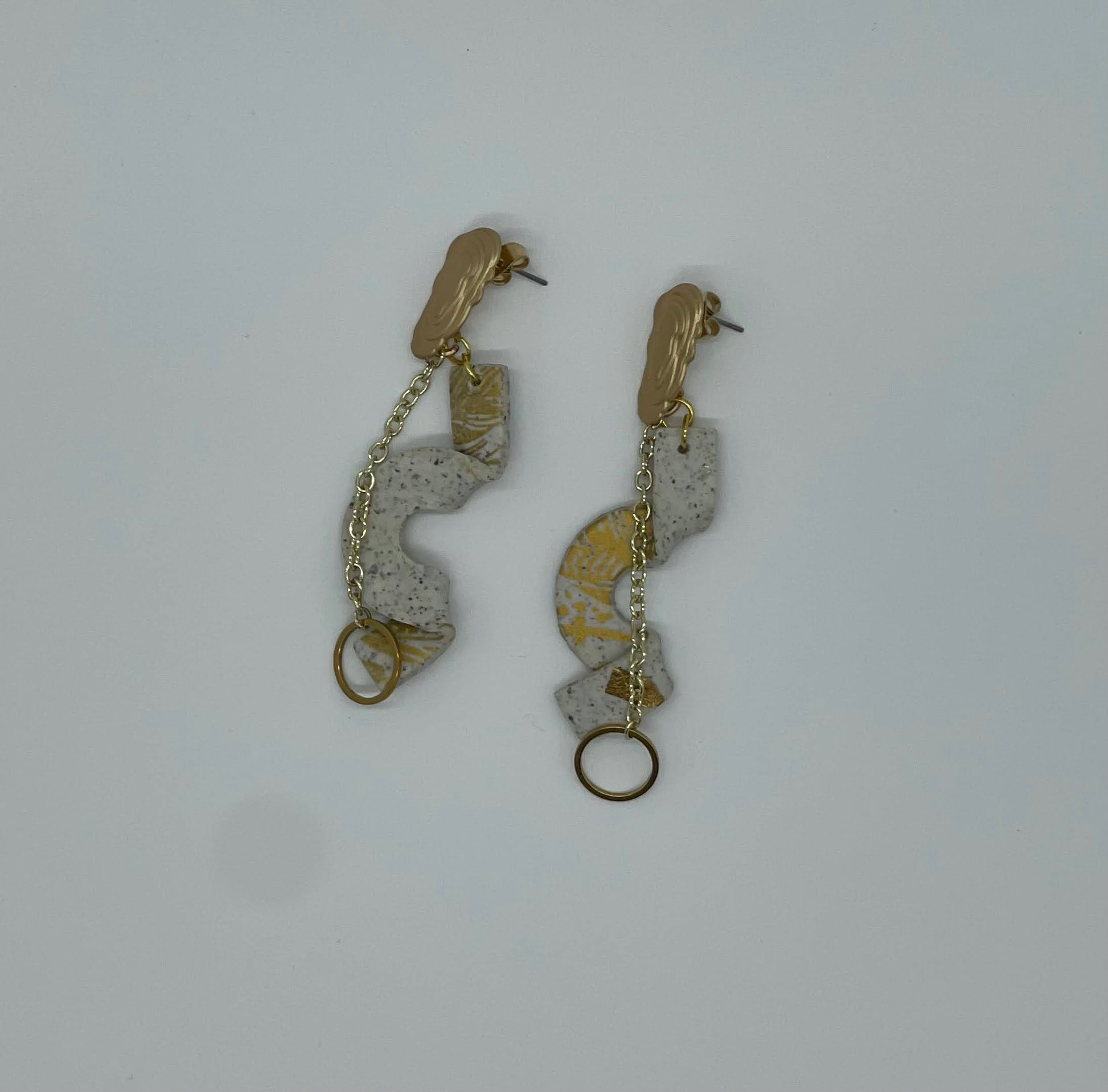 These handmade polymer clay earrings showcase a sophisticated mix of gray and gold granite, exuding elegance and style. The earrings feature an additional bow shape with twisted ends, adding a touch of uniqueness and style to the design.